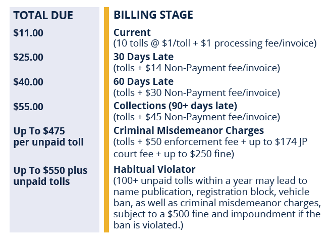 • Legal Action: (per toll, after 120 + days of nonpayment): subject to criminal misdemeanor charge + toll + court fees + up to $250 special fine per unpaid toll