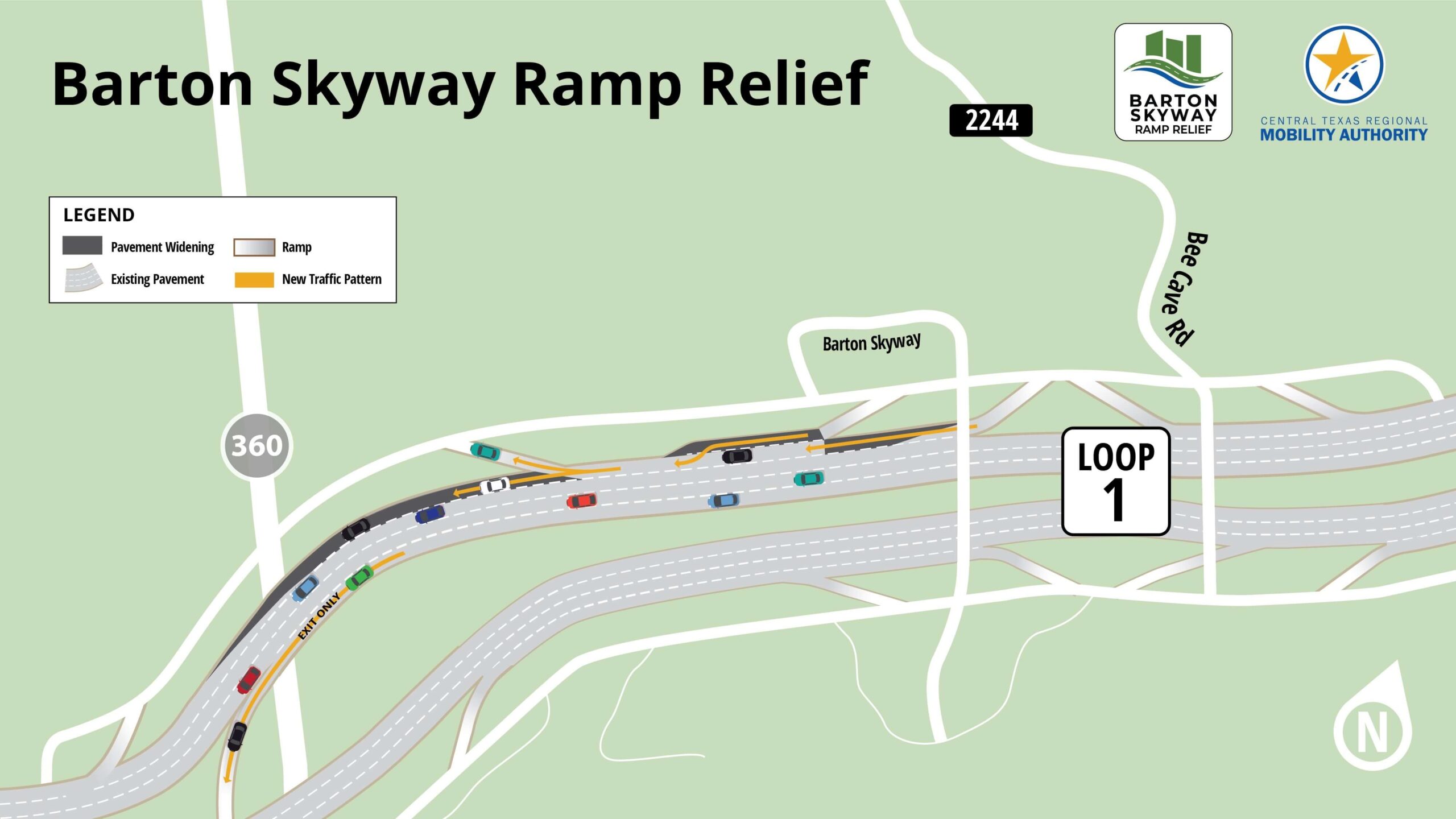 Southbound MoPac between Bee Cave Road and Loop 360 had been plagued by bottlenecks with drivers merging and crossing lanes to exit. The Barton Skyway Ramp Relief Project added pavement and reconfigured the ramps in the area to allow drivers more time and space to merge and travel to their destinations. The entrance ramps from Bee Cave Road and Barton Skyway now feed into a new through lane, and drivers entering from Barton Skyway now have more space to accelerate before merging onto MoPac. Additionally, the left lane has become an Exit Only lane to southbound Loop 360/Capital of Texas Highway with a separate third through lane continuing on southbound MoPac. Map showing location and details of the Barton Skyway Ramp Relief