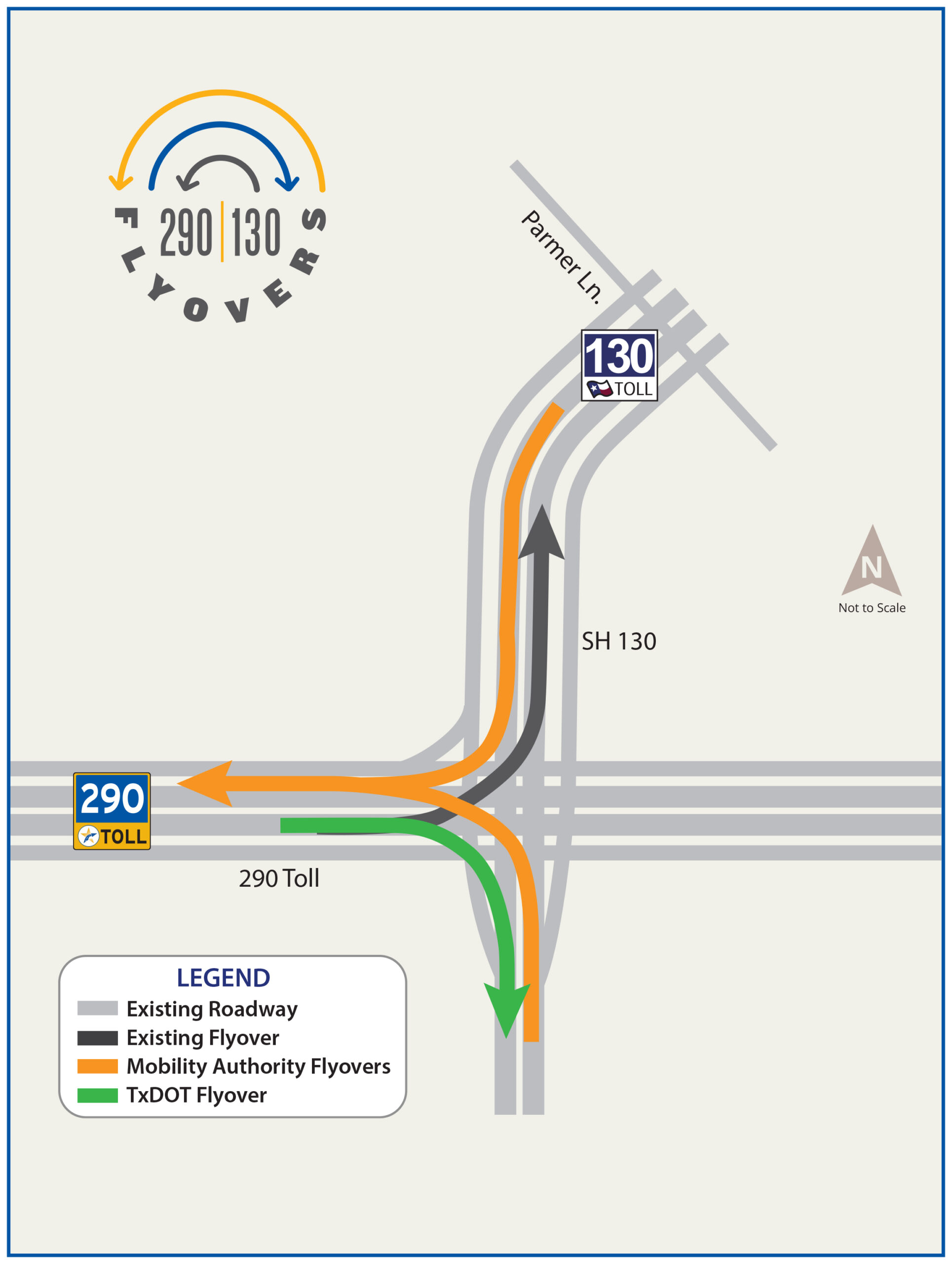 The new flyovers provide drivers safe, efficient, free-flowing direct connections between the two roadways, while also freeing up capacity at the frontage road intersection to benefit drivers who prefer the non-tolled option. It is estimated that the traveling public will save $5 million a year in time as well as fuel and vehicle costs. In addition, the project will improve connectivity for east Travis and Williamson county residents and help attract economic development opportunities to the region.