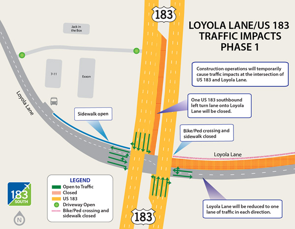 Pedestrian and bicyclist access on Loyola Lane west of US 183 will not be impacted. However, a portion of the sidewalk on Loyola Lane east of US 183 and the pedestrian crossing at Loyola Lane/US 183 will be temporarily closed during this phase of construction.
