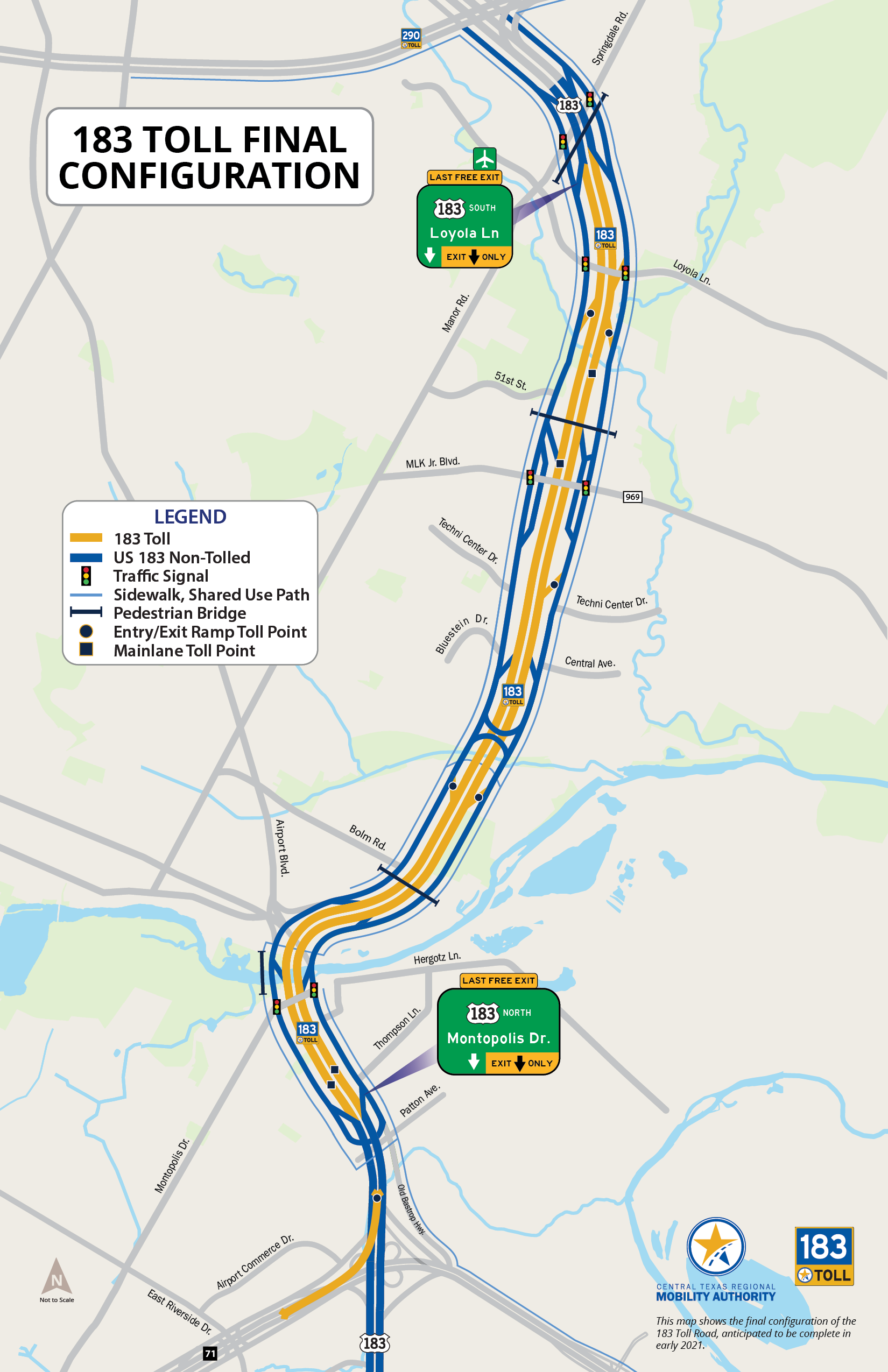 Those looking to bypass traffic congestion have a choice to use 183 Toll. Drivers who prefer not to pay a toll can use the improved non-tolled general-purpose lanes of US 183.